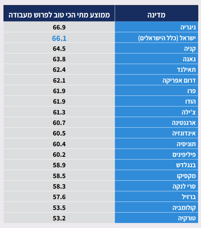 - גיל הפרישה מעבודה לישראלים סבורים שהוא נכון (בממוצע): 66.1 שנים