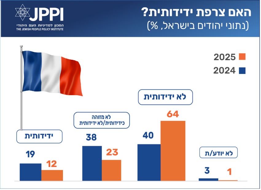 בעוד שבשנה שעברה, כארבעה מכל עשרה יהודים בישראל השיבו כך, השנה חושבים כך כשני שלישים מהמשיבים היהודים (64%). בהתאם, בעוד שבשנה שעברה כחמישית מהמשיבים ראו את צרפת כ״ידידותית", שיעורם ירד השנה לקרוב יותר לעשירית (12%). ירידה בהערכת הידידותיות של צרפת נרשמה השנה גם בקרב הערבים. בשנה שעברה רובם הגדירו את צרפת ידידותית לישראל, השנה, עשו זאת פחות ממחציתם (48%).