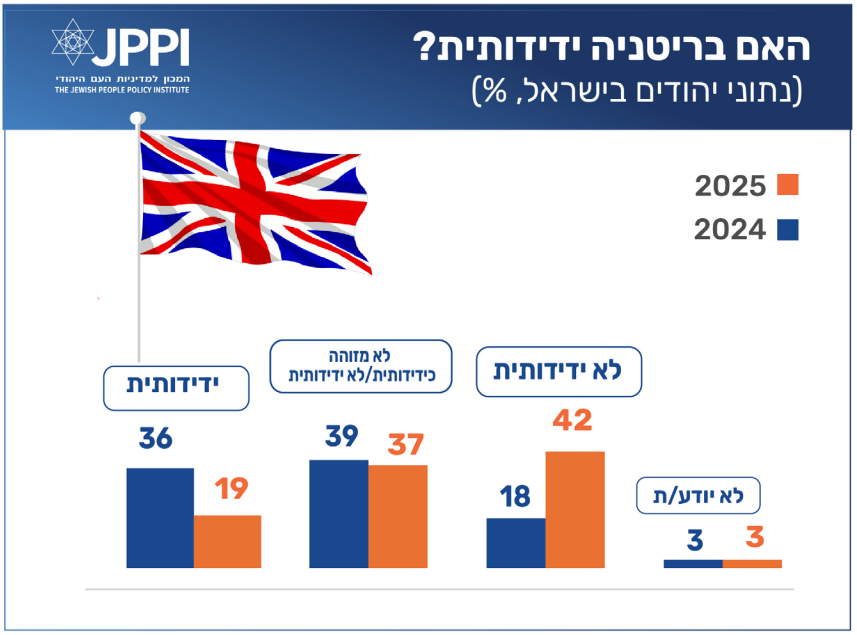 תמונה דומה נרשמת גם ביחס למדינות אחרות באירופה: ביחס לבריטניה – שיעור היהודים בישראל הסבורים כי בריטניה ״אינה ידידותית״ לישראל יותר מהכפיל את עצמו השנה – מ18% בספטמבר 2024 ל-42% החודש. כשליש (37%) סבורים כי בריטניה היא ״לא ידידותית ולא לא-ידידותית״.