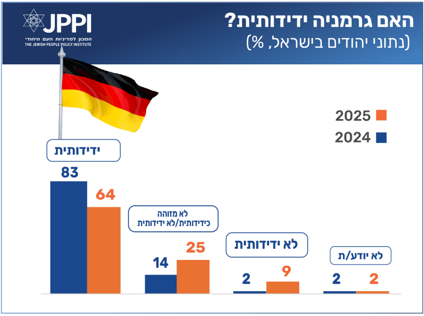 למרות זאת, בהשוואה לשנה שעברה, ניכר שגם היחס לגרמניה הצטנן. בשנה שעברה 83% מהיהודים בישראל הגדירו את גרמניה כידידותית, והיום כאמור המספר ירד ל-64%. שיעורם של מי שסבורים שגרמניה אינה ידידותית נותר יחסית נמוך, פחות מעשרה אחוז.