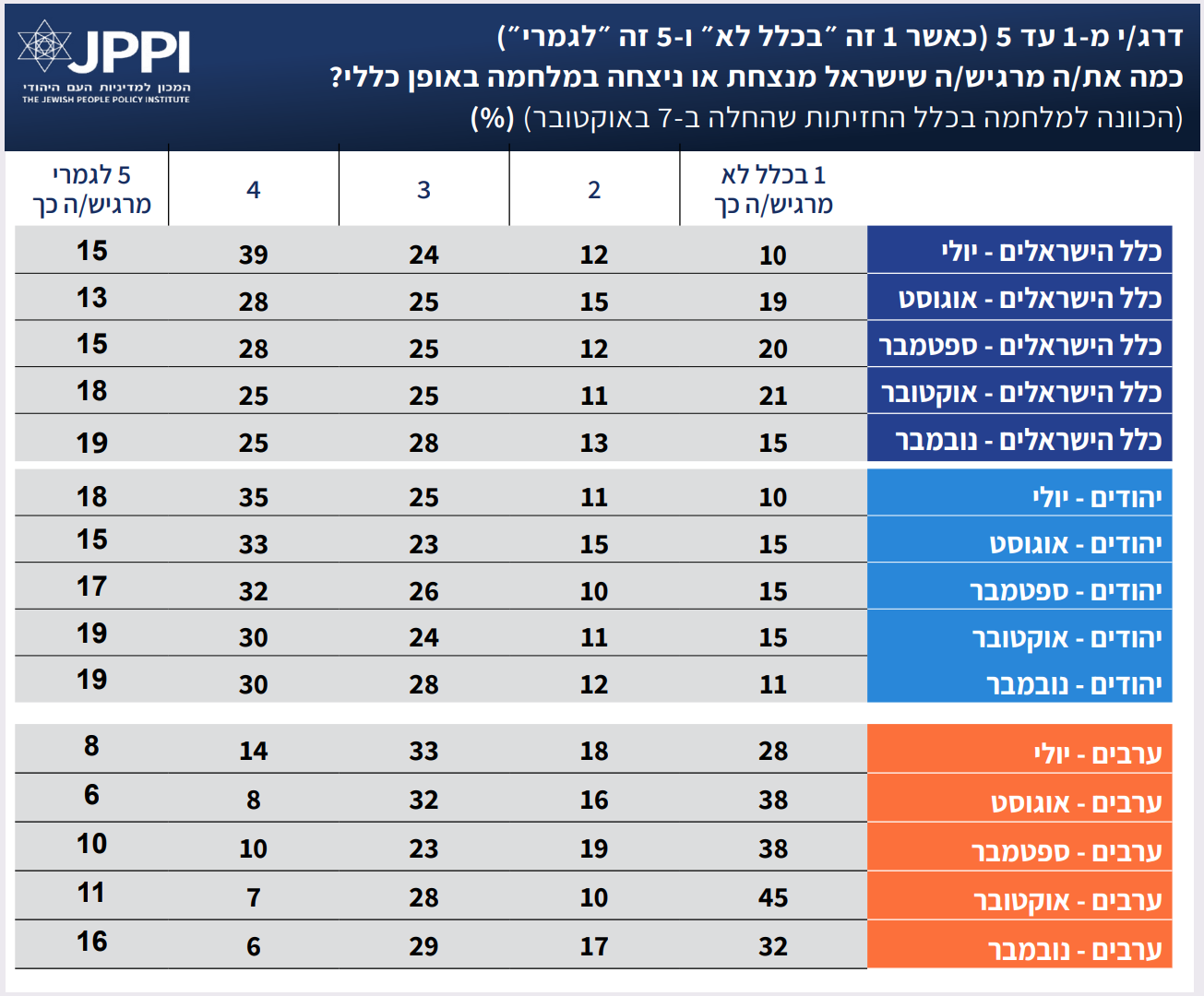 עם סוף המלחמה ירד מעט שיעור הישראלים ש״בכלל לא מרגישים״ שישראל ניצחה במלחמה, אך לא נרשמה עלייה בשיעור הישראלים המעידים כי הם ״לגמרי מרגישים״ שישראל ניצחה במלחמה. בקרב הערבים נרשמה עלייה קלה בשיעור מי שמרגישים כי שישראל ניצחה במלחמה. בסך הכל, פחות ממחצית מהישראלים דירגו את הרגשת הניצחון שלהם כ-4 או 5 מתוך 5. קצת יותר מכמחצית היהודים דירגו כך את הרגשתם.