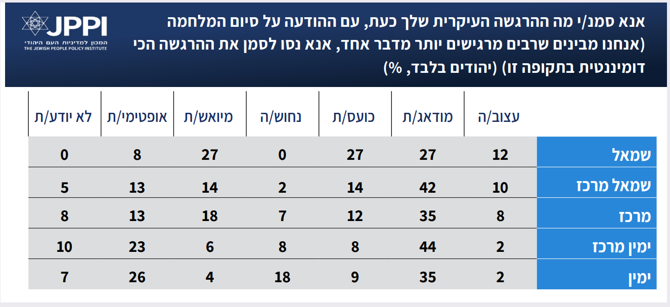 ההרגשה העיקרית בסיום המלחמה מושפעת רבות מהעמדה האידאולוגית של המשיבים. בקרב היהודים, ככול שנעים על הסקלה האידאולוגית מהימין לשמאל עולה שיעור המשיבים שמעידים כי הם עצובים, כועסים או מיואשים. ככול שמתקדמים מהשמאל לימין עולה שיעור המשיבים שמעידים שהם בעיקר נחושים או אופטימיים. בכלל הקבוצות האידאולוגיות יש בין רבע למחצית מהמשיבים שמעידים שהם בעיקר מודאגים. מגמה דומה קיימת גם בחלוקה לפי דתיות – ככול שמתקדמים על הסקלה הדתית מהכיוון הליברלי לכיוון השמרני – עולה שיעור המשיבים שמעידים כי הם אופטימיים או נחושים, ויורד שיעור המשיבים שמעידים כי הם בעיקר כועסים או מיואשים.
