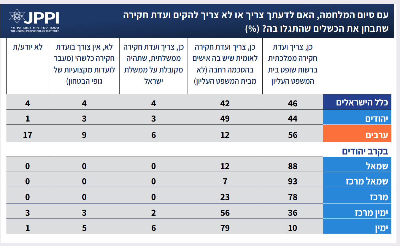 עם סיום המלחמה רוב גדול מאוד (88%) של ישראלים סבורים שיש צורך בוועדת חקירה כלשהי לבירור נסיבות פריצתה. עם זאת אין הסכמה על אופי ומסגרת הועדה שצריכה לקום: 46% תומכים בהקמת ועדת חקירה ממלכתית בראשות שופט מבית המשפט העליון, ו-42% מעדיפים ועדת חקירה לאומית בהרכב מוסכם, שאין בו ייצוג לבית המשפט העליון. 4% מהציבור סבורים שאין צורך בהקמת ועדת חקירה מעבר לוועדות המקצועיות של גופי הביטחון עם סיום המלחמה. בקרב הערבים התמיכה בוועדת חקירה ממלכתית גבוהה יותר (56%). כחמישית מהערבים (17%) לא השיבו לשאלה זו, לעומת אחוז בודד בקרב היהודים.