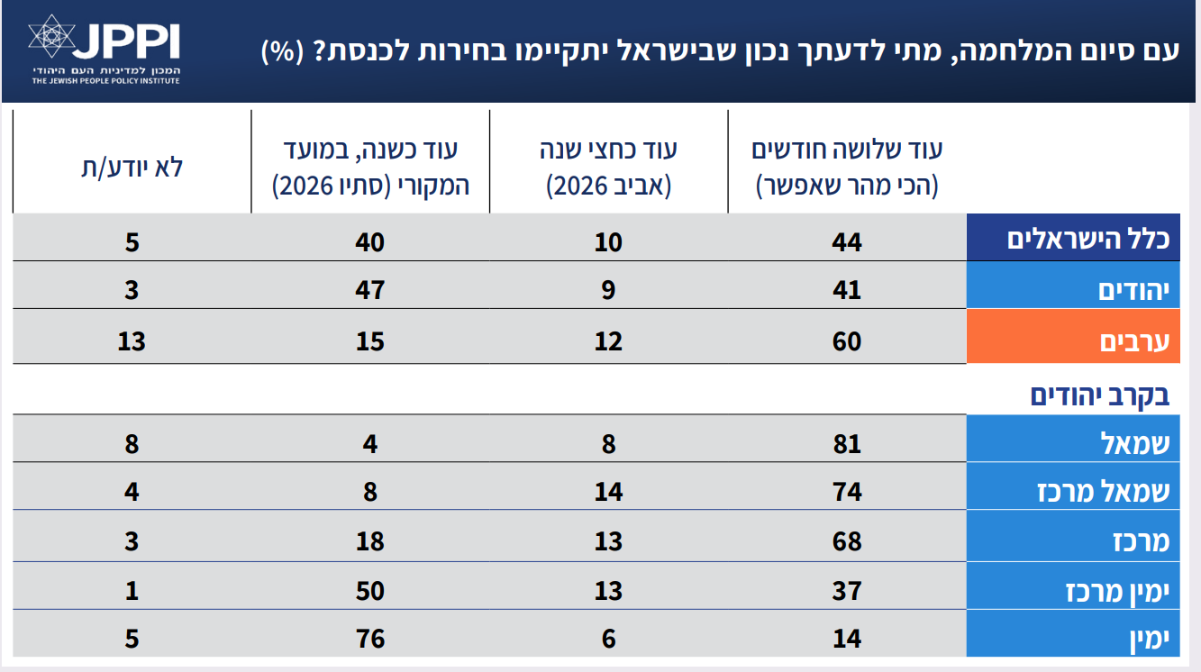 רוב הציבור רוצה שהבחירות הבאות יוקדמו: 44% סבורים שיש לקיים אותן בתוך שלושה חודשים, ועוד 10% רוצים שיתקיימו בעוד כחצי שנה. לעומתם, 40% מעדיפים לקיים אותן במועד המקורי, בסתיו 2026. בקרב הערבים ישנה העדפה גורפת להקדמת הבחירות, שלושה מכל חמישה מהם אומרים שיש לקיים אותן מוקדם ככל האפשר, ושישית (15%) חושבים שנכון שיתקיימו במועד המקורי.