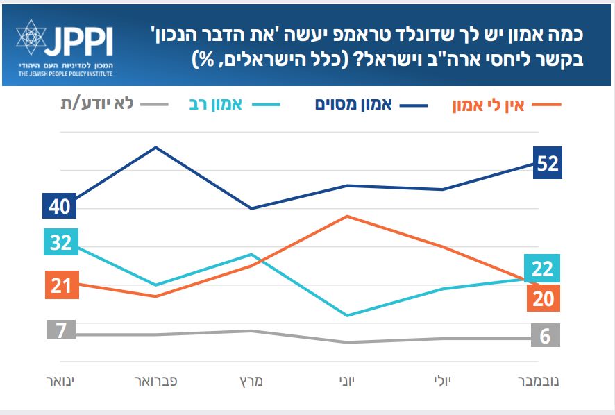 לשם השוואה, בסקר "קול העם" שנערך על ידי JPPI בקרב יהודי ארה"ב, לפני מספר שבועות, הוצגה למשיבים האמירה הבאה "ראש הממשלה נתניהו אמר שנשיא ארצות הברית דונלד טראמפ הוא ׳החבר הגדול ביותר שהיה לישראל אי פעם׳, ו׳שאף נשיא אמריקאי לא עשה יותר למען ישראל… זה אפילו לא קרוב׳." 42% מהמשיבים מקרב פאנל יהודי ארה״ב של המכון הסכימו במידה מסוימת עם הערכה זו (17% הסכימו לחלוטין ו-25% אמרו שהיו נשיאים שהתקרבו לטראמפ, אך שהוא עדיין ה"חבר הגדול ביותר של ישראל"), בעוד שרבע (26%) לא הסכימו ושמינית (12%) סברו שנשיאים אחרים פעלו יותר למען ישראל. כלומר, שיעור היהודים בישראל שסבורים שטראמפ הוא הנשיא הכי ידידותי שהיה לישראל אי פעם גבוה משיעור היהודים בארה"ב שסבורים כך.