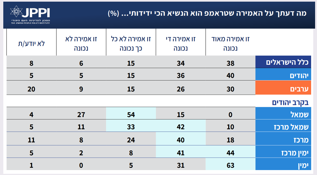 בקרב יהודים תומכי ימין, יש קונצנזוס כמעט מוחלט (94%) של הסכמה עם הצגת טראמפ כידיד הגדול ביותר של ישראל אי פעם. בימין-מרכז התמיכה דומה, ו-85% מסכימים. לעומת זאת, באגף השמאלי (הקטן משמעותית בגודלו) ישנה תפיסה אחרת. רוב גדול בשמאל (81%) סבור שהאמירה אינה נכונה, וגם בשמאל-מרכז יש נטייה לספקנות ביחס לאמירה זו.
