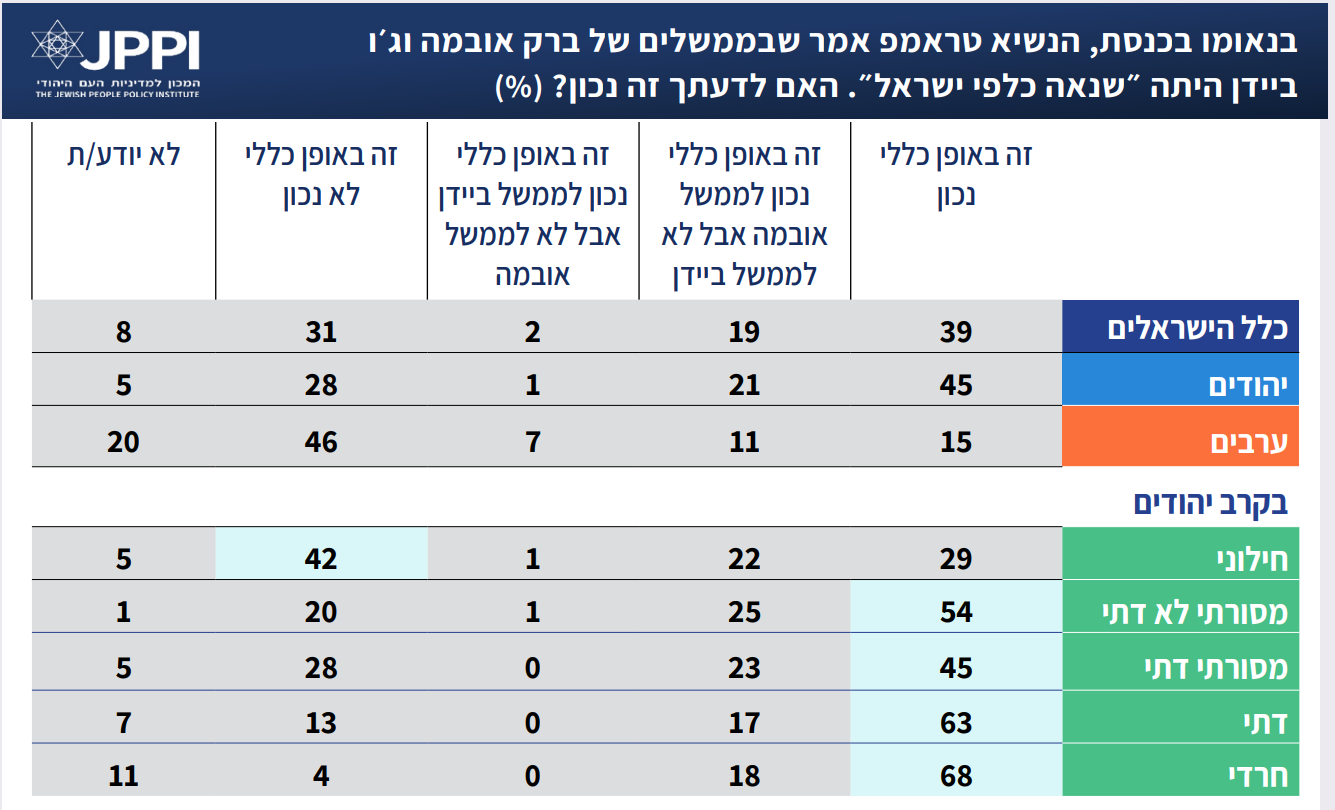 בנאומו בכנסת, הנשיא טראמפ אמר שבממשלים של ברק אובמה ושל ג'ו ביידן הייתה שנאה כלפי ישראל, בדקנו האם הישראלים מסכימים או לא מסכימים עם אמירה זו של הנשיא. מהנתונים עולה כי הציבור הישראלי חצוי ביחס אליהם, אך ישנה נטייה של שיעור לא מבוטל ממנו לקבל את דבריו של טראמפ. 39% מהישראלים סבורים שהאמירה נכונה באופן כללי, ו-19% נוספים חושבים שהיא נכונה ביחס לממשל אובמה בלבד. כלומר, כ-58% מביעים מידה מסוימת של הסכמה עם האמירה. לעומת זאת, כשליש (31%) סבורים שהדברים אינם נכונים. בקרב יהודים התמיכה באמירה גבוהה יותר מזו שבקרב הערבים. שני שלישים מהיהודים (66%) מסכימים עם טראמפ במידה כלשהי, בעוד שבקרב הערבים רבע (26%) מסכימים, וכמחצית (46%) דוחים את דבריו.