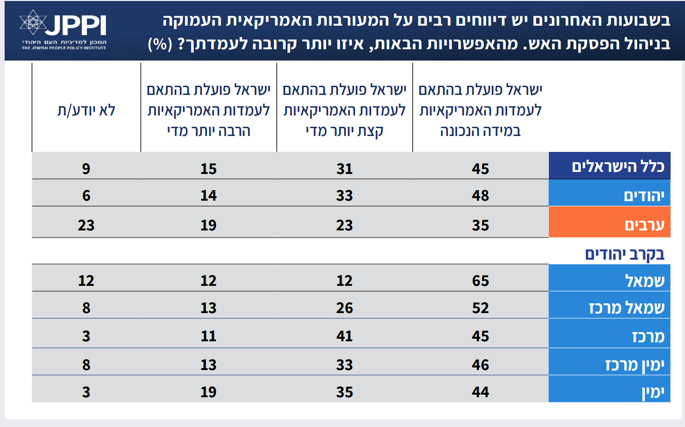 - מחצית מהישראלים סבורים שישראל פועלת בהתאם לעמדות האמריקאיות במידה הנכונה.