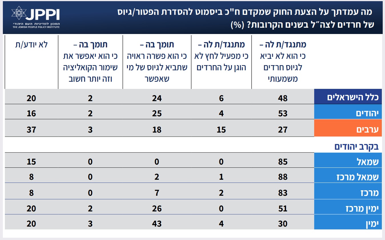 בשאלה זו ניכרים פערים משמעותיים בין העמדות האידאולוגיות השונות – כאשר התמיכה עולה ככל שנעים לכיוון המרכז. כלומר, התנגדות משמעותית מאוד בשמאל (הקטן) ובימין (הקבוצה הגדולה בקרב יהודים בישראל), ותמיכה עולה בקבוצות השמאל-מרכז וימין-מרכז ושיא תמיכה בקבוצת המרכז. במקביל להתנגדות לשלילת זכות הצבעה מחייבי גיוס שאינם מתייצבים, יש רוב בציבור הישראלי המתנגד להצעת החוק של ח"כ בועז ביסמוט להסדרת הפטור/הגיוס של חרדים לצה"ל. מחצית מהישראלים (48%) מתנגדים להצעה בטענה שהיא לא תוביל לגיוס חרדים משמעותי. 6% נוספים מתנגדים לה בשל תחושה שהיא מפעילה לחץ לא הוגן על הציבור החרדי. מנגד, כרבע מהציבור (26%) תומכים בהצעה – רובם מתוך תפיסה שמדובר בפשרה ראויה שתביא לגיוס של חלק מהחרדים, ומיעוט קטן תומכים בה מכיוון שהם מזהים בה אפשרות לשמור על יציבות הקואליציה. בקרב האוכלוסייה הערבית ניכרת מידה גבוהה של אדישות לשאלה, או העדר מעורבות מספקת להשיב עליה. 37% לא ידעו להשיב לשאלה זו, שיעור כפול מזה שנרשם בקרב היהודים.