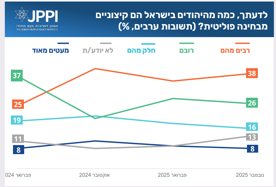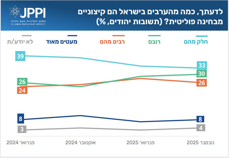 נתונים אלה דומים למדי לנתונים של פברואר 2025. רוב הערבים בישראל רואים ביהודים קבוצה שיש בה ייצוג נרחב לקיצוניות פוליטית: 38% מהמשיבים סבורים שרבים מהיהודים קיצוניים מבחינה פוליטית, ורבע נוספים (26%) טוענים כי “רובם” כאלה. לעומתם, רק מיעוט קטן של 8% סבורים שהקיצוניות מוגבלת למעטים, ו-16% סבורים שמדובר בחלק מהיהודים. שיעור ה"לא יודעים" (13%) מעט גבוה יותר לעומת בדיקות קודמות.