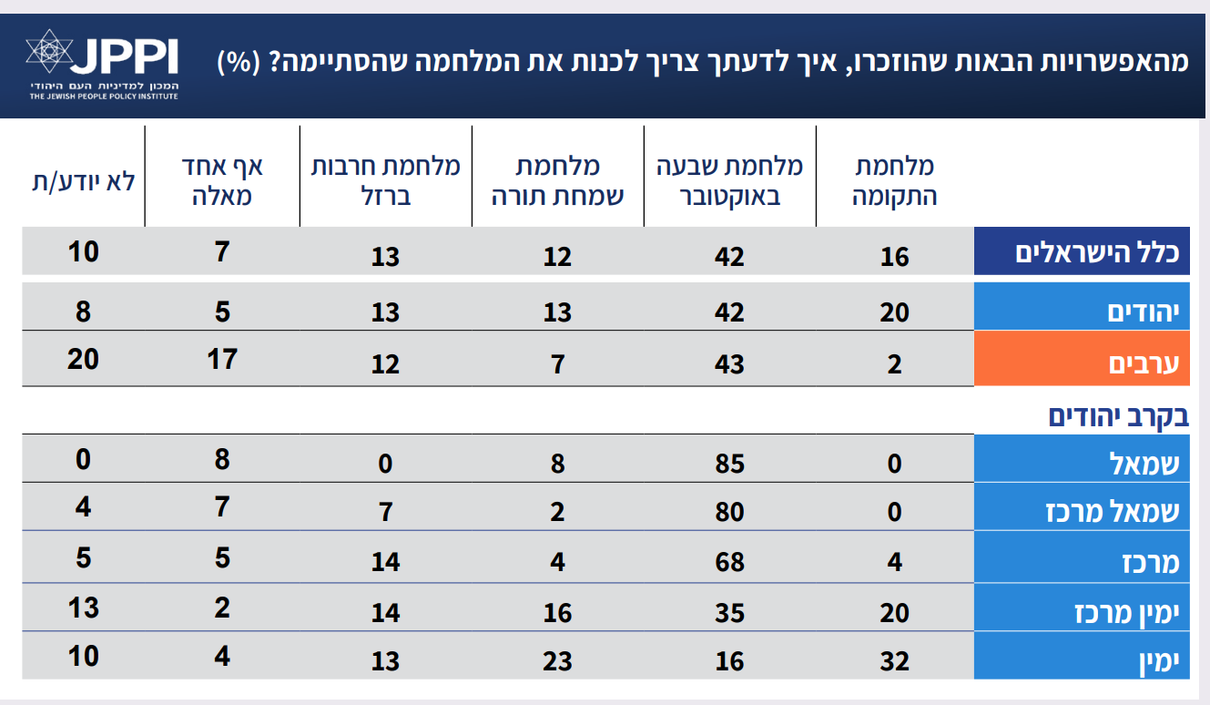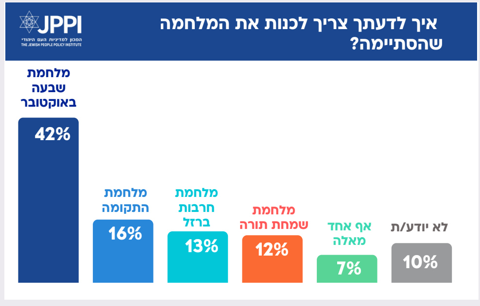 עם סיום המלחמה, הממשלה החליטה לשנות את שמה באופן רשמי מ"מלחמת חרבות ברזל" ל"מלחמת התקומה". בציבור הישראלי אין הסכמה על השם הנכון למלחמה. מארבעה שמות שהוצעו בסקר, שני משיבים מכל חמישה ישראלים (42%) מעדיפים את השם "מלחמת שבעה באוקטובר", שישית (16%) בחרו בשם הממשלתי "מלחמת התקומה“ ושמינית (13%) מעדיפים את "מלחמת חרבות ברזל“, השם המקורי שניתן לה על ידי צה"ל. שמינית (12%) תומכים בשם שהוספנו לרשימה – "מלחמת שמחת תורה", 7% סבורים שאף אחד מהשמות המוזכרים בשאלה לא מתאים ועשירית (10%) לא ידעו להשיב לשאלה.