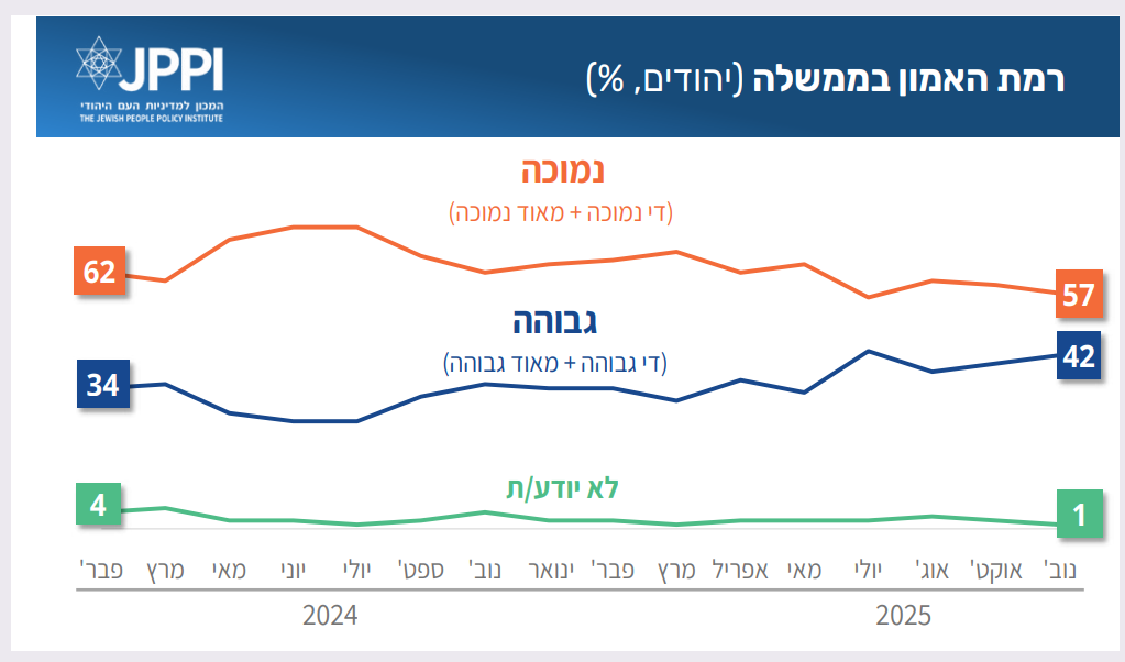 החודש עלתה במעט רמת האמון של היהודים בממשלה. בנקודת הזמן הנוכחית בערך שלושה מכל חמישה יהודים בישראל מצהירים על רמת אמון נמוכה בממשלה, בעוד שניים מכל חמישה מדווחים על רמת אמון גבוהה – נתון דומה לזה שנרשם בחודשים האחרונים, שהם תקופה של אמון יחסית גבוה בממשלה לעומת חודשים קודמים, ולמעשה מאז תחילת המלחמה. כבכל החודשים, גם החודש רמת האמון של הערבים בממשלה נמוכה מאוד לעומת זו של היהודים: לשלושה רבעים (72%) רמת אמון נמוכה בממשלה ולרבע (23%) רמת אמון גבוהה.