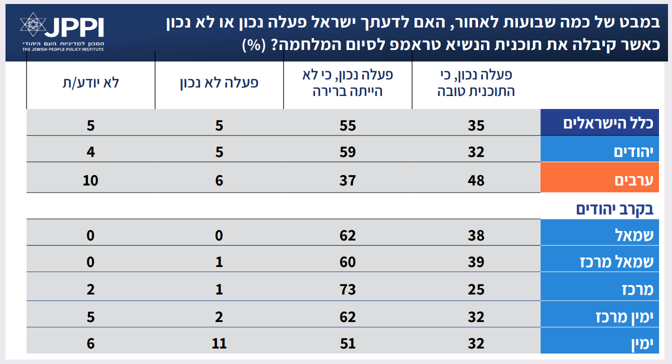 רוב גדול מאוד של הציבור הישראלי (90%) סבור שישראל פעלה נכון כאשר קיבלה את תוכנית הנשיא טראמפ לסיום המלחמה. 55% סבור כי היה עליה לנהוג כך משום ש״לא הייתה לה ברירה״, ו-35% סבורים שצריך היה לקבל את התוכנית משום שמדובר בתוכנית טובה. אחד מכל עשרים ישראלים סבור שישראל פעלה לא נכון כאשר הסכימה לתוכנית, ועוד 5% לא ידעו להשיב לשאלה. בקרב הערבים ישנה תפיסה חיובית יותר של התוכנית: מחצית (48%) מהם סבורים שהתוכנית טובה, לעומת שליש (32%) מהיהודים. בנוסף, שיעור הערבים שסבורים כי ישראל פעלה נכון בגלל שלא הייתה לה ברירה (37%), נמוך משיעור היהודים הסבורים כך (59%).
