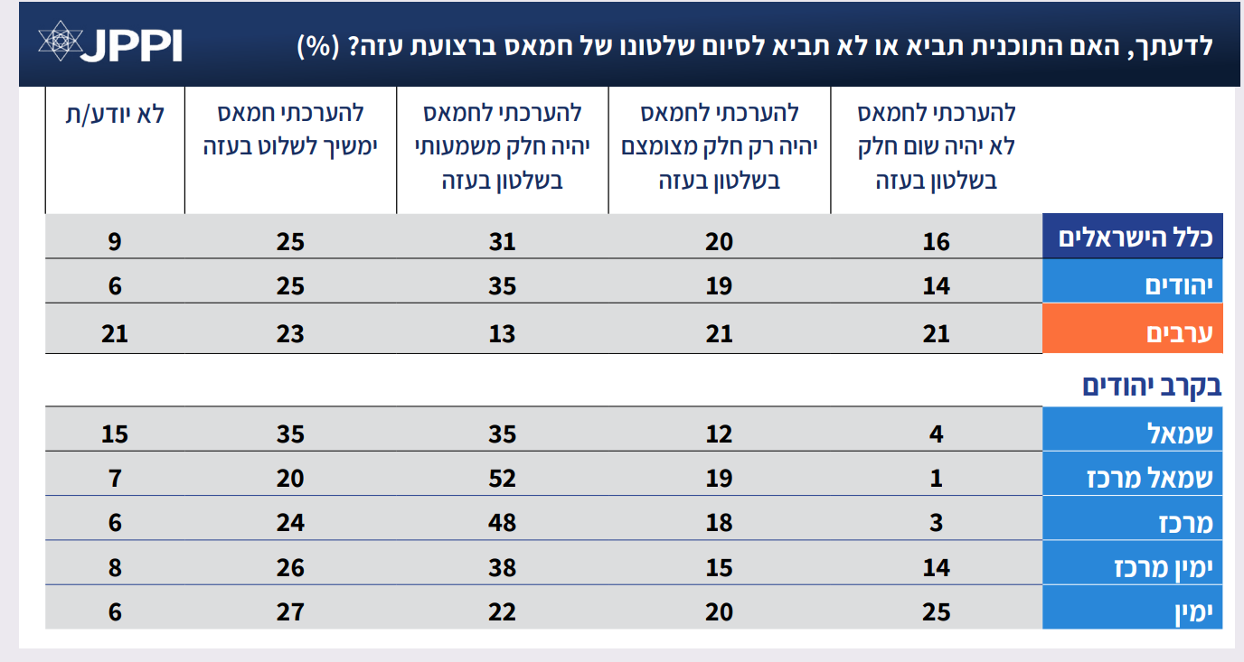 על פי התוכנית, שלטון חמאס בעזה אמור לבוא לסופו, ועמדת ישראל בעניין זה לא השתנתה. עם זאת, רוב הציבור אינו מניח שמטרה זו של המלחמה תמומש במלואה. שליש מהישראלים (31%) סבורים שלחמאס יהיה ״חלק משמעותי״ בשלטון בעזה ועוד רבע (25%) סבורים כי חמאס ימשיך לשלוט בעזה. לעומת זאת, רק שישית (16%) מהישראלים סבורים שלחמאס כלל לא יהיה כלל חלק בשלטון בעזה וחמישית (20%) מעריכים כי יהיה לו חלק, אך מצומצם, בשלטון ברצועה. בקרב היהודים ניכרת פסימיות גבוהה עוד יותר – 60% מעריכים שלחמאס יהיה חלק משמעותי בשלטון או שימשיך לשלוט בעזה. בקרב הערבים שיעור זה נמוך משמעותית ועומד על שליש (36%). חמישית (21%) מהערבים השיבו לשאלה זו ב״לא יודעים״. בחלוקה אידאולוגית עולה כי בימין קיימת אופטימיות גבוהה לעומת זו שנרשמה בשאר הקבוצות: בעוד שבקרב הימין מחצית מעריכים שלחמאס יישאר תפקיד שלטוני משמעותי, בשאר הקבוצות ישנו רוב שחושב כך.