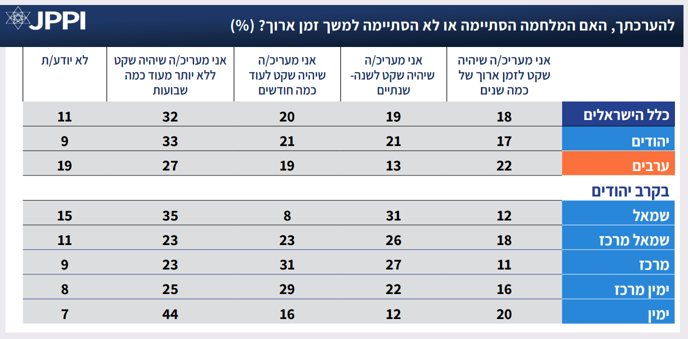 עם סיום המלחמה בחנו האם הציבור הישראלי חושב שמדובר בסיום לזמן ארוך או בהפוגה קצרה יחסית עד לחידוש הלחימה. שליש (32%) מהישראלים סבורים שהשקט יחזיק מעמד רק עוד כמה שבועות, חמישית (20%) מעריכים שהשקט ימשך עוד כמה חודשים, חמישית (19%) חושבים שיהיה שקט לשנה-שנתיים וחמישית נוספים (18%) מעריכים שיושג שקט ממושך של כמה שנים. ביחס לתשובות היהודים, בקרב הערבים נרשמה הערכה שההפוגה תהיה ארוכה יותר – 22% מאמינים שצפוי שקט ארוך טווח.