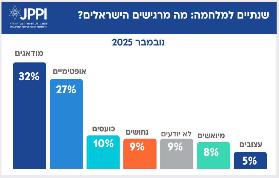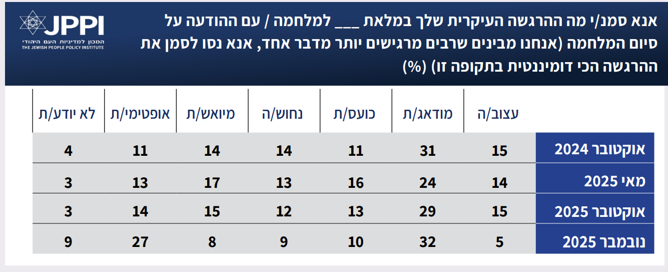 בדומה לבדיקה שערכנו במלאת שנה, שנה וחצי ושנתיים למלחמה, גם החודש בחנו את הרגשות העיקריים של הישראלים עם ההודעה על סיום המלחמה. שליש (32%) מהישראלים בעיקר מודאגים, רבע (27%) בעיקר אופטימיים, עשירית (10%) בעיקר כועסים, עשירית נוספים (9%) בעיקר נחושים, 8% מיואשים ואחד מכל עשרים ישראלים בעיקר עצוב עם סיום המלחמה. ביחס לפעמים הקודמות בהן בחנו את רגשות הישראלים, החודש הייתה עליה בשיעור האופטימיים. שינוי זה בא בשל שינוי משמעותי מאוד בעמדת הערבים. באוקטובר, רק 2% מהערבים ציינו את הרגש ״אופטימיים״ החודש עשו זאת רוב המשיבים הערבים (52%). החודש נרשם גם השיעור הגבוה ביותר (9%) של ישראלים שלא ידעו להשיב לשאלה.
