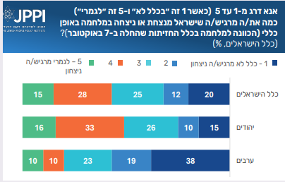 חמישית מהציבור בישראל (20%) אינם חשים ״שישראל מנצחת ו/או ניצחה במלחמה באופן כללי״, ורק 15% מרגישים שישראל מנצחת באופן מלא. בסולם של 1 (לא מנצחים) עד 5 (מנצחים), רוב הציבור בוחר באפשרויות במרכז הסקאלה – 25% בוחרים באפשרות 3 ועוד 28% בוחרים ב־4. בקרב היהודים – 16% מרגישים ניצחון מלא ועוד שליש בוחרים ב־4. כלומר, כמעט מחצית למעשה מצביעים על תחושת ניצחון. בקרב הערבים – 38% "בכלל לא" חשים ניצחון ורק 10% בוחרים בדרגה 5. מי שבוחרים ב-4 או 5 במגזר הערבי הם בעיקר משיבים מהעדה הדרוזית.