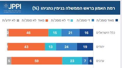 בסך הכל, החודש סומכים על נתניהו 37% מהמשיבים, שיעור זהה לממצא מחודש יולי, אם כי, החודש שיעור האומרים ״די סומך״ עלה, ושיעור האומרים ״מאוד סומך״ ירד. כמעט מחצית מהציבור הישראלי (46%) הצהירו בספטמבר כי הם “מאוד לא סומכים” על ראש הממשלה. רק כשליש (16% “מאוד” ועוד 21% “די סומכים”) מביעים בו אמון. בקרב היהודים תמונת האמון מעט טובה יותר. 43% “מאוד לא סומכים”, לעומת 19% ש״מאוד סומכים״. בקרב הערבים, כמעט שישה מכל עשרה (59%) מצהירים על חוסר אמון מוחלט, ורק 6% מוכנים לומר שהם סומכים עליו מאוד. כל אלה באים מקרב הנוצרים והדרוזים.