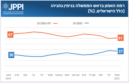 כאשר משווים את הנתונים לחודשים קודמים, מתגלה יציבות יחסית, אם כי, לאחר המבצע באיראן עלו במעט נתוני האמון בנתניהו, ונותרו ברמתם זו לאורך הקיץ. בהקשר מתודולוגי יש להזכיר כי לפני כמה חודשים שונה נוסח שאלת האמון לאחר בדיקה, ועברנו לשאול בנוסח הבודק האם ישראלים ״סומכים״ או ״לא סומכים״ על מנהיגים וארגונים (בנוסח הקודם שאלנו על ״רמת האמון״).