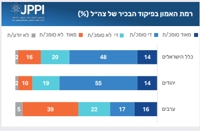 הפיקוד הבכיר של צה״ל נהנה מרמות אמון גבוהות בהרבה מאלה של ההנהגה הפוליטית בכלל ושל ראש הממשלה בפרט: 62% מהציבור הכללי סומכים עליו (14% “מאוד” ו־48% “די”). בקרב היהודים – שיעור האמון גבוה עוד יותר, 69%. בקרב הערבים – 61% אינם סומכים על פיקוד צה״ל, ורק מיעוט (33%) סומכים עליה.