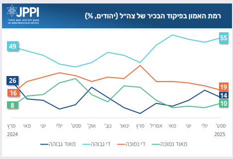 בהשוואה לחודשים קודמים: ביוני וביולי 65% מהציבור הכללי הצהירו שהם סומכים על צה״ל. בספטמבר הנתון ירד ל־62%. הירידה בולטת במיוחד בקרב יהודים, תומכי ימין וימין־מרכז, ייתכן שעל רקע המחלוקת בין הדרג הפוליטי לדרג הצבאי בשאלת ההתנהלות בעזה, אך לא פחות מזה בשל המשך המשבר הנוגע לגיוס חרדים. תומכי המפלגות ש״ס ויהדות התורה הם שמביעים את האמון הנמוך ביותר בפיקוד הבכיר של צה״ל, לצד תומכי עוצמה יהודית.