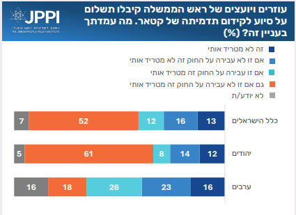 בסקר בחנו בשאלה אחת גם את מה שכונה בתקשורת “קטאר־גייט” – פרשה שבה נחשפו קשרים בין גורמים ישראליים הקרובים לראש הממשלה לבין מימון או השפעה קטארית. פרשה זאת נמצאת בחקירה, שהתגובות עליה מקבילות במידה מסויימת להתפלגות המחנות הפוליטיים. בסקר נמצא כי יש רוב בציבור (52%) של מי שסבורים כי מדובר בעניין מטריד גם אם יתברר לאחר החקירה שלא מדובר בעבירה על החוק. 12% סבורים שפרשה מטרידה רק אם יוכח שמדובר בעבירה על החוק. כמעט שליש (29%) מהמשיבים אינם רואים בפרשה עניין מטריד. בקרב היהודים – 61% הגדירו את הפרשה מטרידה בכל מקרה; בקרב הערבים –35%.