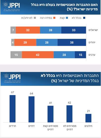 בשאלה ראשונה בחנו האם לדעת הישראלים האנטישמיות ברחבי העולם היא תוצר של המדיניות הישראלית. רוב הישראלים כי מתקיים קשר כזה – במידה רבה או במידה מסויימת. מקרב הערבים, רוב גדול סבורים כך, מקרב היהודים רוב קטן יותר. כשליש מהישראלים סבורים שהתגברות האנטישמיות היא ״בכלל לא בגלל המדיניות של ישראל״ (38% מהיהודים). במענה לשאלה זו ניכרים הבדלים גדולים על פי מפתח אידיאולוגי, וגם על פי סולם הדתיות. באופן כללי, ככל שנעים על הסקלה ימינה ולכיוון הדתי יותר, כך עולה שיעור המשיבים שאין קשר בין מדיניות ישראל לבין התגברות האנטישמיות. למעשה, בציבור הדתי והחרדי, רוב המשיבים סבורים כי ה אנטישמיות אינה בגלל המדיניות של ישראל. לעומת זאת, בציבור החילוני 43% משיבים שהתגברות האנטישמיות היא ״במידה רבה״ בגלל מדיניות ישראל, ועוד 32% משיבים שהיא ״קצת״ בגלל המדיניות של ישראל.