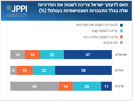 למרות שינו רוב של מי שסבורים שיש זיקה בין המדיניות הישראלית לבין התגברות של תופעות אנטישמיות, כמחצית מהישראלים (47%) סבורים שאין לשנות את מדיניות ישראל. בקרב היהודים – רוב מוחלט של 56%. בקרב הערבים – רק 11% מחזיקים בעמדה זו, ו־48% ענו “לא יודע”. כלומר, ישנם לא מעט ישראלים הסבורים שהאנטישמיות היא תוצר של המדיניות, אך שזו אינה סיבה לשנות מדיניות. למעשה, גם בקבוצות של ישראלים שהאמון שלהם במדיניות ישראל או בממשלת ישראל יחסית נמוך, אין רוב של משיבים הסבורים שישראל צריכה לשנות את מדיניותה ״בגלל התגברות האנטישמיות״ (חלקם מן הסתם סבורים שטוב שתשנה את מדיניותה מסיבות אחרות). תומכים של מפלגות האופוזיציה נוטים לעמדה שיש צורך לשנות ״קצת״ את המדיניות. תומכים של מפלגות הקואליציה נוטים לעמדה שאין צורך לשנות כלל את המדיניות. לדוגמה, מקרב תומכי הליכוד 93% משיבים שאין לשנות מדיניות, מקרב תומכי ישראל ביתינו 37% אומרים שאין לשנות מדיניות, ו-41% אומרים שיש לשנות אותה ״קצת״ בגלל תופעות של אנטישמיות.