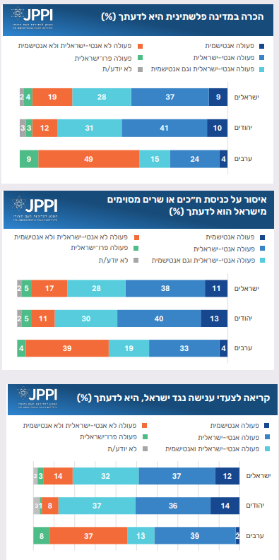 בקבוצות המרכז (שמאל מרכז, מרכז, ימין מרכז) הנטייה היא להגדיר את ההכרה במדינה פלשתינית בעיקר כפעולה אנטי ישראלית. בקבוצת הימין, שהיא הגדולה מכלל הקבוצות, הנטיה היא להגדיר אותה כאנטי ישראלית ואנטי שמית. הקבוצה היחידה שבה יש רוב הסבור שאין מדובר בפעולה אנטי ישראלית או אנטישמית היא קבוצת השמאל, הקטנה יחסית (כ-7% מכלל היהודים). בעקבות הטלת איסור משתמע או מפורש על ביקורים של שרים וחברי כנסת מסויימים בכמה מדינות (לאחרונה, ביטול נסיעה של ח״כ שמחה רוטמן לאוסטרליה), שאלנו באופן דומה על המשמעות של איסור כזה בעיני הישראלים. כפי שאפשר לראות, התגובות לשאלה זו דומות לתגובות על הכרה במדינה פלשתינית. ההבדל הוא בעיקר בקרב ערבים, שנוטים לראות בפעולה זו ״אנטי ישראלית״ יותר מכפי שהם רואים הכרה במדינה פלשתינית כפעולה אנטי ישראלית.