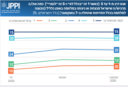 בהשוואה לחודשים יולי–אוגוסט ניכרת החודש מגמת שחיקה קלה בתחושת ההישג, אולי בשל ההתרחקות מהמבצע נגד איראן, שרוב הציבור זיהה כהצלחה. ביולי 18% מהציבור הכללי העידו שהם “לגמרי” חשים ניצחון, באוגוסט 17%, ובספטמבר ירד הנתון ל־15%. במקביל, שיעור ה”כלל לא” עלה מ־17% ביולי ל־20% בספטמבר. כלומר, ככל שהמלחמה נמשכת בלי הישגים מוחשיים, הציבור מאבד תחושת ניצחון.
