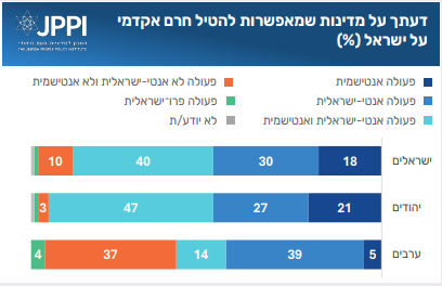שאלה אחרונה בהקשר זה נגעה למדינות שמאפשרות חרם אקדמי על מוסדות ישראלים. בשאלה זו עלה שוב שיעור הישראלים שנוטים להגדיר פעולה כזאת גם כאנטישמית (ולא רק כאנטי ישראלית). כמעט מחצית מהיהודים מגדירים את הפעולה הזאת כאנטישמית ואנטי ישראלית, שיעור המגדירים אותה כאנטישמית בלבד (כלומר, בעיניהם הדגש הוא במקרה זה על מהלך אנטי יהודי ולא על מהלך אנטי ישראלי) עולה בשאלה זו בחדות ל-21% מקרב המשיבים היהודים.