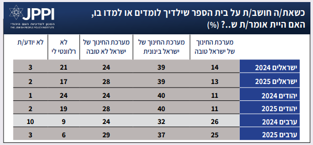 עם פתיחת שנת הלימודים החדשה, סקר ספטמבר 2025 חזר לבחון כמה שאלות הנוגעות לעמדות הציבור כלפי החינוך בישראל – רמת שביעות הרצון, סוג בתי הספר, והעדפות בנוגע להוספה או להפחתה של שעות לימוד בתחומים שונים. התמונה שמתקבלת היא של מערכת ערכים שונה בין קבוצות. בשאלה הראשונה על מערכת החינוך נבחנה שביעות הרצון הכללית ממנה.13% בלבד הגדירו את מערכת החינוך כ”טובה״. זה נתון כמעט זהה לזה שהתקבל לשאלה זהה בספטמבר לפני שנה. כ-40% סבורים שמערכת החינוך ״בינונית״, וכרבע סבורים שהיא ״לא טובה״. עם זאת, שיעור גבוה בחרו לא להשיב על השאלה (בעיקר משיבים ללא ילדים). מקרב המשיבים, כשליש סבורים שהמערכת לא טובה, ועוד מחצית שהיא בינונית.