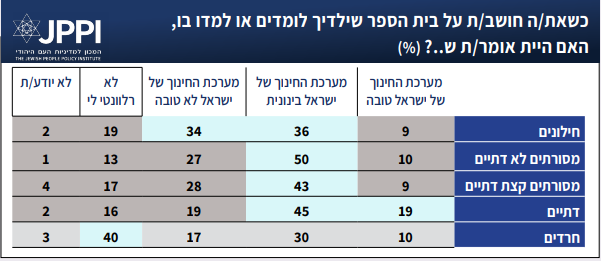 מכיוון שמערכת החינוך היהודית בישראל מחולקת למגזרים על פי סולם דתיות, יש טעם לבחון בנפרד את רמת שביעות הרצון של הורים ממגזרים שונים מהמערכות השונות שיש להם היכרות איתן. ככלל, חלק משמעותי מהחרדים השיבו על השאלה ״לא רלבנטי לי״, או בשל גילם הצעיר, או בשל העובדה שאינם שולחים את ילדיהם למערכת החינוך הישראלית (אלא לחינוך חרדי פרטי). הדתיים מרוצים ממערכת החינוך (הממלכתית דתית) יותר מהחילונים והמסורתיים (שרוב מכריע מהם הולכים למערכת הממלכתית – למעט חלק מה״מסורתיים קצת דתיים״). כחמישית מהדתיים סבורים שמערכת החינוך טובה, שיעור כפול לעומת קבוצות אחרות. לעומת זאת, בקרב חילונים 34% סבורים שמערכת החינוך לא טובה. שיעור גבוה משמעותית לעומת דתיים, וגבוה גם לעומת מסורתיים. מבין המשיבים הערבים, בולט חלקם של המשיבים הנוצרים הסבורים שמערכת החינוך ״לא טובה״ (38%). מקרב המוסלמים, שהם הרוב הגדול של ערביי ישראל, 62% סבורים שמערכת החינוך ״בינונית״.