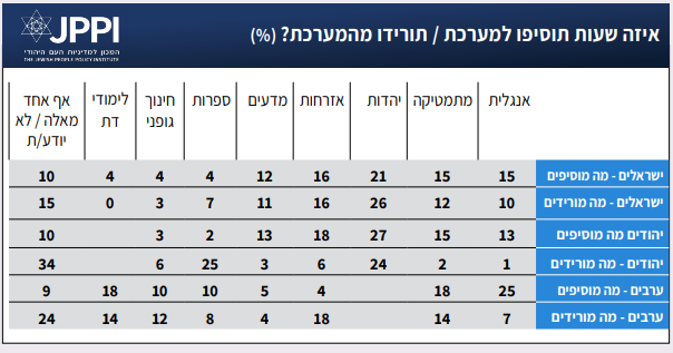 בשתי שאלות מקבילות, בחנו השנה אילו מקצועות ישראלים היו מתגברים, ועל איזה היו מוותרים, לו היתה ניתנת להם הבחירה (או מוטלת עליהם החובה) להוסיף או להוריד שעות לימוד מהמערכת. נוסח השאלה היה: אם יכולת להוסיף / להוריד 3 שעות הוראה בשבוע לכל בתי הספר בישראל, מהאפשרויות הבאות, איזה מקצוע היית מתגבר/ת / מאיזה מקצוע היית מוריד כחובה לכולם? ליהודים ניתנה אפשרות להוסיף או להוריד לימודי יהדות, לערבים ניתנה אפשרות מקבילה להוסיף או להוריד לימודי דת. בטבלה המוצגת כאן אפשר לראות לכלל הישראלים, וכן ליהודים לחוד ולערבים לחוד, איזה מקצועות מקבלים תוספת של 3 שעות מאיזה שיעור מהמשיבים, ואיזה מקצועות מקוצצים בשלוש שעות על ידי איזה שיעור מהמשיבים (מהאפשרויות שהצענו).