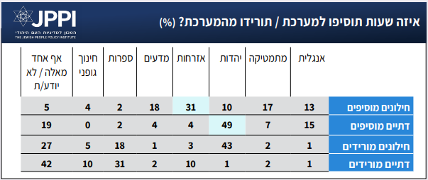 השוואה של קבוצת החילונים, שכמעט כולה בחינוך הממלכתי, לקבוצת הדתיים (הקטנה יותר) שכמעט כולה בחינוך הממלכתי דתי, מלמדת על ההבדל בבחירת המקצועות שיש להוריד ולהוסיף למערכת. שימו לב, שהשאלה לא בחנה איזה שעות המשיבים רוצים שיוסיפו ״לילדים שלהם״ אלא איזה שעות בעיניהם צריך להוסיף או להוריד ״לכל בתי הספר בישראל״. כלומר, כאשר המשיבים אומרים שצריך להוסיף אנגלית, או להוריד אזרחות, זה משום שהם סבורים שכלל המערכת זקוקה לתוספת הזאת, או יכולה לעשות את הויתור הזה. המקצוע שמקבל את התוספת בשיעור הגבוה ביותר – ובפער משמעותי לעומת מקצועות אחרים – שונה בקרב דתיים וחילונים. מקרב החילונים, כשליש היו מוסיפים לכלל בתי הספר שעות אזרחות. מקרב הדתיים כמחצית היו מוסיפים לכלל בתי הספר שעות יהדות. נדמה שעמדה זו, בשני המקרים, משקפת הערכה אידיאולוגית של צרכי החברה הישראלית, לא פחות מאשר הערכה של מצב המקצועות הללו בבתי הספר.