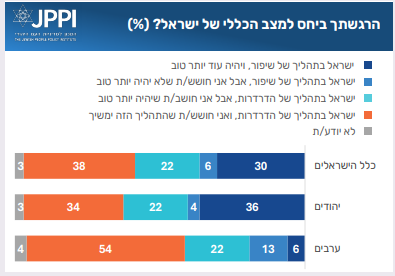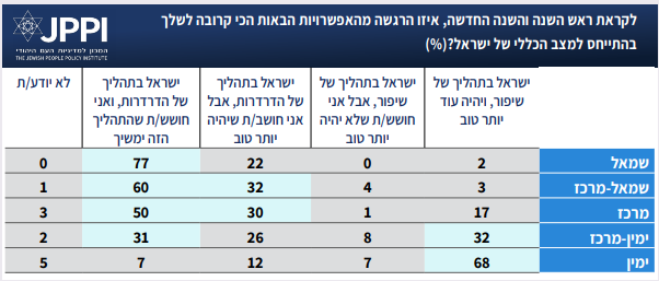 ערב ראש השנה, אנחנו בוחנים כיצד הציבור מעריך את השנה שחלפה, וכיצד הוא צופה אל השנה הבאה. השורה התחתונה אינה מפתיעה. הציבור נכנס לשנה החדשה בתחושת פסימיות, הן ביחס לישראל והן ביחס לעולם. פחות משליש מהישראלים, וכשליש מהיהודים, סבורים שישראל כבר נמצאת ״בתהליך של שיפור, ויהיה עוד יותר טוב״. עוד 22% סבורים ש״ישראל בתהליך של הדרדרות, אבל אני חושב/ת שיהיה יותר טוב״. כלומר, כמחצית מהישראלים מניחים שהעתיד יהיה טוב יותר, אך רק קצת יותר ממחציתם סבורים שתהליך השיפור כבר החל. יותר ממחצית מהערבים, שליש מהיהודים, ובסך הכל כמעט ארבעה מכל עשרה ישראלים מזהים תהליך הדרדרות, ללא אופטימיות ביחס לאפשרות ליציאה ממנו.