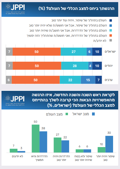 תחושה חזקה יותר של פסימיות ניכרת כאשר ישראלים נשאלים על מצב כלל העולם. כמחציתם סבורים שהעולם בתהליך של הדרדרות, ואני חושש/ת שהתהליך הזה ימשיך. עוד כרבע סבורים שהעולם מדרדר, אבל בעתיד ישתפר. הערכת הישראלים ביחס למצב העולם דומה למדי בקרב יהודים וערבים. השוואה של עמדות הישראלים ביחס למצב ישראל והעולם מאפשר להתרשם שלישראלים אמון רב יותר ביכולת של ישראל לייצר לעצמה עתיד טוב יותר לעומת שאר העולם.