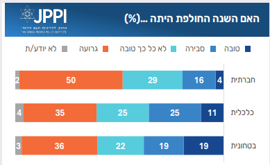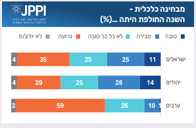רוב גדול של ישראלים טוען כי השנה החולפת הייתה לא טובה מבחינה חברתית. רוב הישראלים מעריכים שמצבה של ישראל ישתפר.