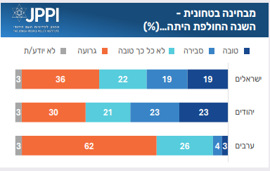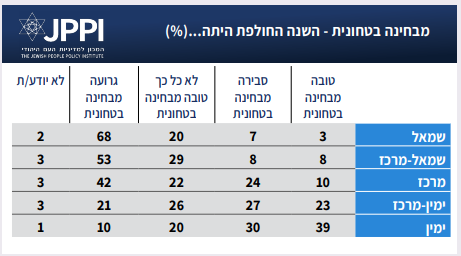 דירוג השנה הבטחונית בקרב היהודים מתנהל על פי מפתח אידיאולוגי. מקרב תומכי הימין, יש רוב של מי שאומרים שהשנה היתה טובה או סבירה. תומכי ימין מרכז חלוקים בערך חצי-חצי בשאלה זו, ובקבוצות מהמרכז ושמאלה יש רוב בקרב מי שסבורים שהשנה היתה גרועה או לא טובה מבחינה בטחונית.