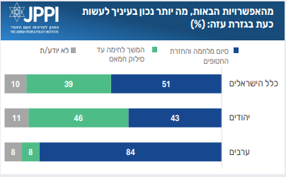 הסקר החודש מלמד שיש רוב קטן מכלל הציבור שבמענה לשאלה ספציפית זו מעדיף את סיום המלחמה והחזרת החטופים גם במחיר הישארות חמאס בשלטון, לעומת 39% שמעדיפים להמשיך בלחימה עד לסילוק חמאס (השאר לא יודעים). רוב זה נשען במידה רבה על תמוכה גורפת של הערבים בהפסקת המלחמה, בעוד שבקרב היהודים – הציבור כמעט חצוי (43% בעד עסקה, 46% בעד לחימה). נוסח השאלה אומנם שונה קלות מהחודש שעבר, כדי להבהיר בצורה ברורה יותר שמדובר בשאלה תיאורטית, שאינה מתייחסת לדילמה שאכן נמצאת על השולחן, אך הנתונים דומים למדי. באוגוסט 54% תמכו בסיום המלחמה (51% בספטמבר), וקצת יותר משליש בהמשכה (37%, לעומת 39% בספטמבר).