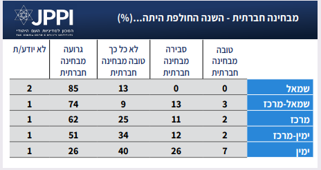 השאלה החברתית היא זו שביחס אליה יש אחדות דעים יחסית. כמעט אין הבדל בתשובות בין יהודים לבין ערבים, ואמנם ניכרים פערים בין קבוצות יהודיות על פי עמדה אידיאולוגית, אולם בכל הקבוצות ישנו רוב של מי שסבורים שהשנה החולפת היתה לא טובה או גרועה מבחינה חברתית.