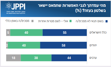 לאפשרות שחמאס ימשיך לשלוט בעזה ביום שאחרי המלחמה יש רוב שלא מסכים ״בשום תנאי״, זאת הגם שמקרב המשיבים הערבים רק מיעוט בוחר באפשרות זו. מקרב המשיבים היהודים, 55% אמרו שלא יסכימו בשום תנאי לאפשרות שחמאס יישאר בשלטון. 40% אמרו ש״אולי כן״ לצורך השגת מטרות אחרות (מן הסתם, החזרת החטופים וסיום המלחמה), ו-5% מסכימים לזה באופן כללי.