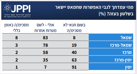 בסוגיה זו, של המשך שלטון חמאס, ניכר הבדל גדול מאוד על פי עמדה אידיאולוגית, כאשר בימין ישנו רוב גורף שלא מסכים לכך בשום תנאי, בימין-מרכז עדיין רוב גדול שלא מסכים לכך בשום תנאי, ומהמרכז ושמאלה רוב שישקלו להסכים לאפשרות כזאת ״לשם מטרות אחרות״. עמדת הדרוזים שהשתתפו בסקר דומה לזו של הימין-מרכז (אך מדובר בקבוצת נדגמים קטנה). עמדת התומכים במפלגות הקואליציה חדה בתמיכתה בעמדה המוצהרת של הקואליציה – שמשמעה שהדחת חמאס מהשלטון היא תנאי לסיום המלחמה ואינה נתונה למשא ומתן.
