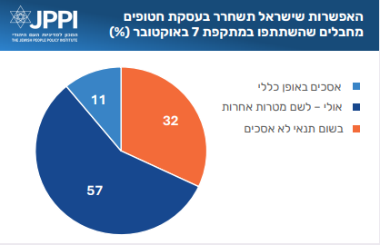 שאלת התנאי הבאה עסקה בעסקה לשחרור חטופים שתכלול גם ״שחרור מחבלים שהשתתפו במתקפת 7 באוקטובר״. רוב הציבור, מסכים לזה (11%) או ״אולי״ מסכים לזה (57%). רוב זה קיים גם בקרב יהודים וגם בקרב ערבים. מקרב היהודים, רק בקבוצת תומכי הימין יש רוב של מתנגדים לאפשרות הזאת – אך מהימין-מרכז ושמאלה ישנו רוב שמוכן לשקול תשלום של מחיר כזה תמורת עסקת חטופים.