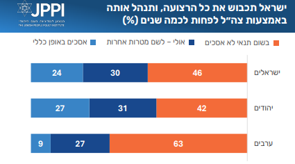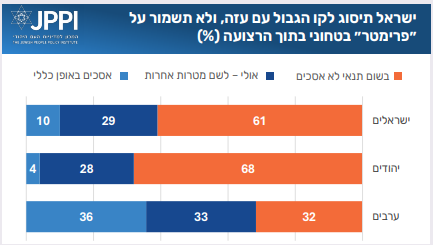 הציבור היהודי מתנגד ברוב משמעותי לאפשרות של נסיגה לקו הגבול של הרצועה בלי לשמור על ״פרימטר״ בטחוני. כמעט שבעה מכל עשרה יהודים לא מסכימים לאפשרות כזאת ״בשום תנאי״. כרבע מהיהודים מוכנים לשקול אותה. מקרב הערבים, כשליש מתנגדים, שליש מוכנים לשקול, ושליש מסכימים. בחלוקה אידיאולוגית, יהודים בקבוצות המרכז והימין (ימין מרכז וימין) מתנגדים לנסיגה ללא שמירה על פרימטר. בקבוצות השמאל יש הסכמה לנסיגה כזאת תמורת מטרות אחרות. הסכמה לויתור על פרימטר בולטת בקרב משיבים שכוונת ההצבעה הנוכחית שלהם היא לדמוקרטים, ליש עתיד ולמפלגה בראשות גדי איזנקוט.