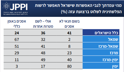 את האפשרות שישראל תאפשר לרשות הפלשתינית לשלוט ברצועת עזה, יש רוב של כ-60% שמוכנים לקבל או לשקול. 41% מתנגדים לאפשרות זו בכל תנאי. במענה לשאלה זו אין הבדל גדול בין יהודים לבין ערבים, ופערים בתשובות ניכרים בעיקר בקרב יהודים על פי השתייכות למחנה אידיאולוגי, כאשר בימין ישנה התנגדות גורפת לאפשרות זו, בימין מרכז התנגדות משמעותית, אך רוב שמוכן לשקול את האפשרות, ומהמרכז ושמאלה תמיכה מסוייגת או מלאה באפשרות. מקרב בוחרי הליכוד, מפלגתו של ראש הממשלה, 73% מתנגדים בכל תנאי לאפשרות זו, והמצב דומה בקרב בוחרי כל שאר מפלגות הקואליציה.