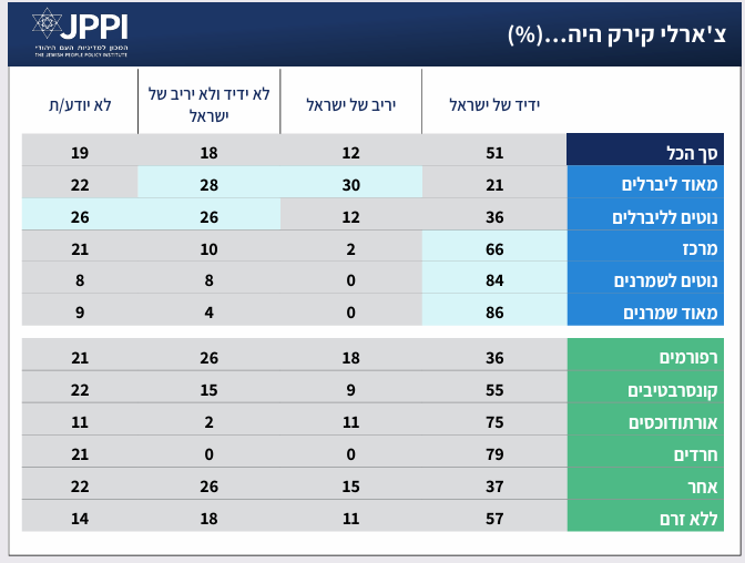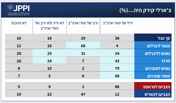 בעקבות הרצח שאלנו את משתתפי הפאנל האם להבנתם קירק היה ידיד או יריב של ישראל ושל יהודי ארה"ב. שניים מכל חמישה יהודים בארה"ב מזהים את קירק כידיד של יהודי ארה"ב, שליש (29%) רואים בו יריב של יהודי ארה"ב, חמישית (18%) רואים בו דמות ניטרלית ביחסו ליהודי ארה"ב, ו-16% לא ידעו להשיב על השאלה. חלוקה לפי עמדה אידיאולוגית (ראו טבלה) ולפי דתיות ניכרים פערים בתשובות: בעוד ש-79% מהחרדים ו-62% מהאורתוכסים רואים בקירק ידיד של יהודי ארה"ב, 41% מהרפורמים ו-24% מהקונסרבטיבים רואים בו "יריב" של היהודים בארה"ב. בחלוקה לפי הצבעה יש פערים משמעותיים – בעוד ש-86% ממצביעי טראמפ רואים בצ'רלי קירק ידיד של יהודי ארה"ב, 12% בלבד ממצביעי האריס סבורים כך. יתרה על כך, מחצית (47%) ממצביעי האריס רואים בקירק יריב של יהודי ארה"ב.