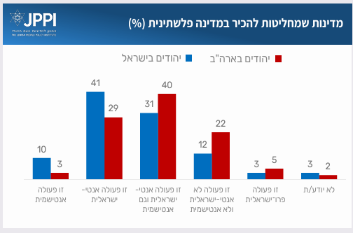 במקביל לכינוס העצרת הכללית של האו״ם ולהודעה של מדינות רבות על הכרתן במדינה פלשתינית, בחנו האם יהודי ארה"ב מקבלים את הטענה המושמעת על ידי חלק מבכירי ממשלת ישראל שצעד כזה הוא אנטי-ישראל או אנטישמי. ככלל, רוב גדול של המשיבים מקרב יהודי ארה"ב מקבלים טענה זו באחת מגרסאותיה. שניים מכל חמישה סבורים כי מדובר בפעולה אנטי-ישראלית ואנטישמית. 29% חושבים שמדובר במהלך אנטי-ישראלי וחמישית (22%) חושבים שזו פעולה לא אנטי-ישראלית ולא אנטישמית. שיעור כמעט אפסי סבור שמדובר בפעולה שהיא רק אנטישמית ושיעור דומה חושבים שמדובר בפעולה פרו-ישראלית. בשאלה זו ניתן לזהות פער לעומת התשובות של היהודים בישראל כפי שתועדו מוקדם יותר החודש במדד JPPI של החברה הישראלית. ביחס ליהודים בישראל, שיעור כמעט כפול של יהודי ארה"ב נוטים לראות את ההכרה במדינה פלשתינית כפעולה שאינה אנטי-ישראלית ואינה אנטישמית, או כפעולה פרו ישראלית 27% לעומת 15%.