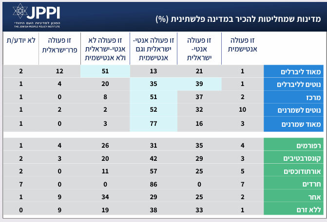 בחלוקה אידאולוגית רוב השמרנים והמשתייכים לקבוצת ה"מרכז" סבורים שהכרה במדינה פלשתינית היא פעולה אנטי-ישראלית ואנטישמית. מנגד מחצית מה"מאוד ליברלים" סבורים שזו פעולה לא אנטי-ישראלית ולא אנטישמית. מגמה דומה קיימת גם בחלוקה לפי דתיות – ככול שמתקדמים על הסקלה הדתית מהכיוון הליברלי לכיוון השמרני עולה שיעור המשיבים שסבורים כי הכרה במדינה פלשתינית זו פעולה אנטי-ישראלית ואנטישמית. בכל הקבוצות הדתיות נרשם רוב שסבורים כי מהלך כזה הוא אנטי-ישראלי, אך אין הסכמה אם מדובר במעשה אנטישמי.