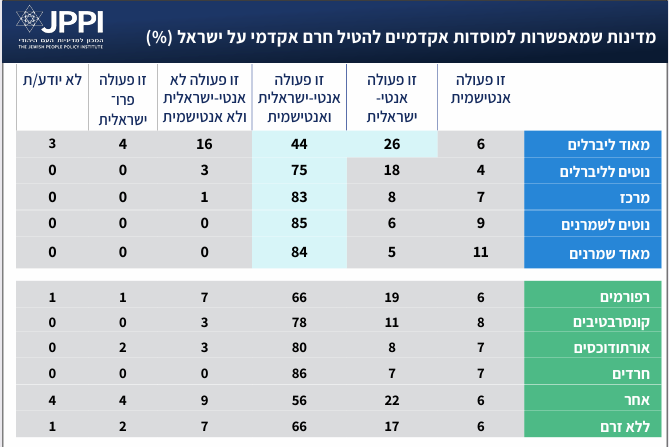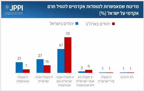 בדומה לשאלה הקודמת, גם בשאלה זו הנתונים מצביעים על קשר ברור בין זהות אידאולוגית ודתית לבין תפיסת הקריאות לצעדי ענישה נגד ישראל על רקע המצב ההומניטרי בעזה. ככל שהעמדה הפוליטית נוטה יותר לשמרנות, כך גוברת הנטייה לראות את קריאות אלה כפעולות גם אנטי-ישראליות וגם אנטישמיות. שאלה נוספת עסקה במדינות שמאפשרות למוסדות אקדמיים להטיל חרם על ישראל. מהנתונים עולה כי ישנה הסכמה גבוהה הרבה יותר בקרב רוב יהודי ארה"ב בנוגע לסוגיה זו – 70% רואים בכך פעולה שהיא גם אנטי-ישראלית וגם אנטישמית, שיעור גבוה משמעותית בהשוואה ליהודים בישראל. בנוסף, 15% ממשתתפי הפאנל מגדירים את המהלך כאנטי-ישראלי, ורק 6% סבורים שמדובר בצעד שאינו אנטי-ישראלי ואינו אנטישמי.